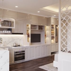 Vốn dĩ, đặc trưng của căn hộ studio chính là tất cả các không gian nằm trên một không gian. Và đây cũng là một hình thức của không gian mở. Vì thế, bạn đừng lãng quên đặc trưng này nhé. Ngay từ cửa ra vào, bạn có thể thấy không gian phòng bếp kết hợp tủ áo, tủ trang trí bố trí dọc theo chiều dọc căn hộ với đầy đủ tiện nghi hiện đại: bồn rửa, tủ bếp, bếp từ, tivi…